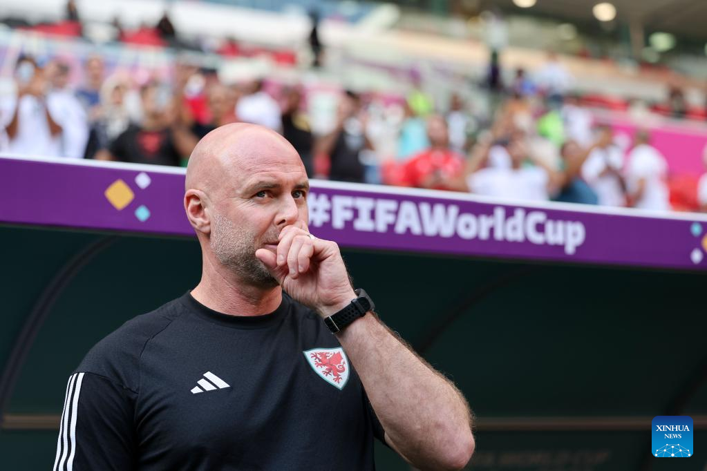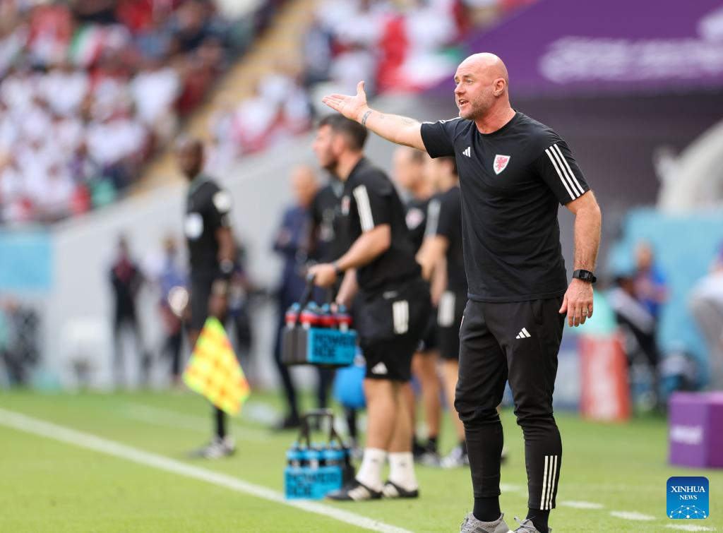Rob Page, head coach of Wales, reacts before the Group B match between Wales and Iran at the 2022 FIFA World Cup at Ahmad Bin Ali Stadium in Al Rayyan, Qatar, Nov. 25, 2022. (Xinhua/Xu Zijian)