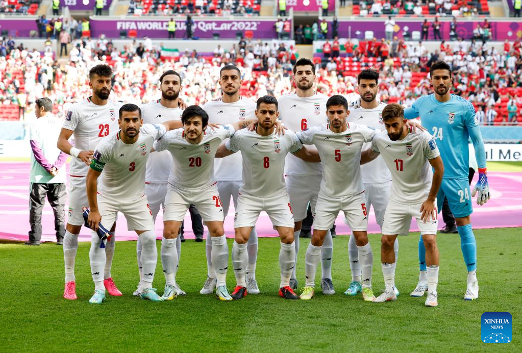 Players of Iran pose for group photos before the Group B match between Wales and Iran at the 2022 FIFA World Cup at Ahmad Bin Ali Stadium in Al Rayyan, Qatar, Nov. 25, 2022. (Xinhua/Wang Lili)