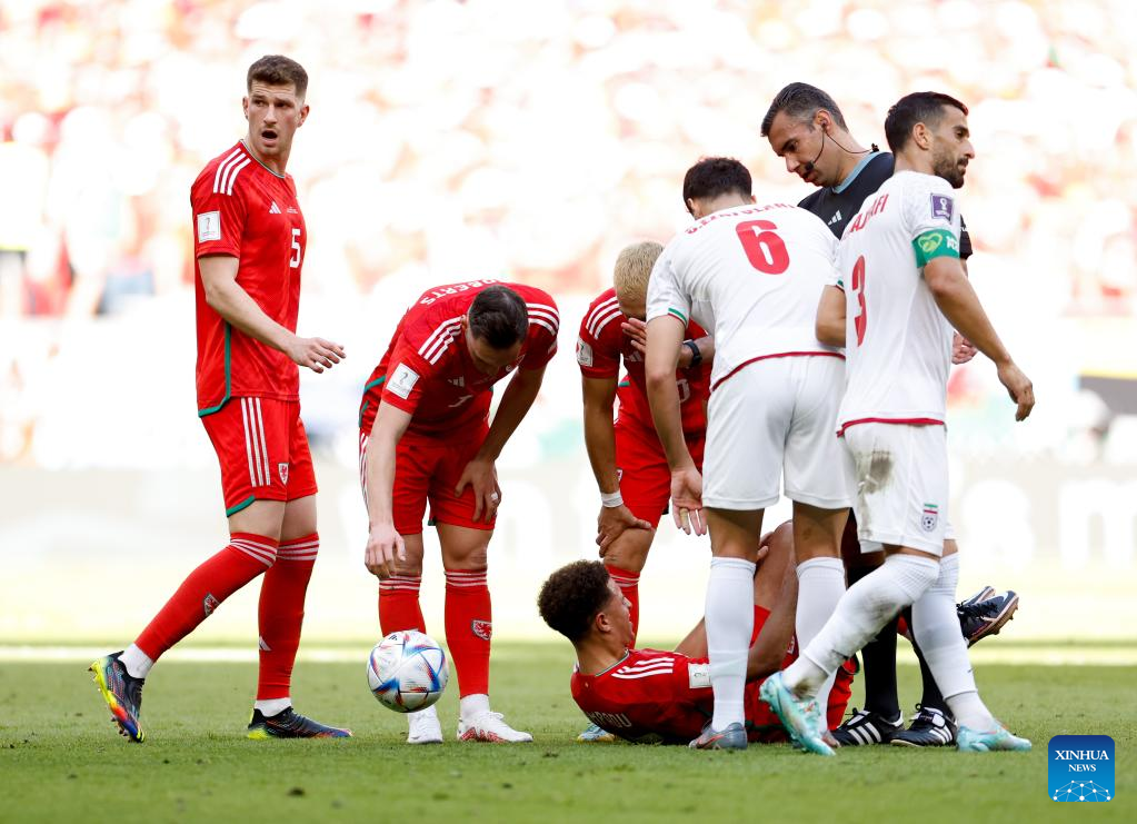 Ethan Ampadu (bottom) of Wales reacts after falling down during the Group B match between Wales and Iran at the 2022 FIFA World Cup at Ahmad Bin Ali Stadium in Al Rayyan, Qatar, Nov. 25, 2022. (Xinhua/Wang Lili)
