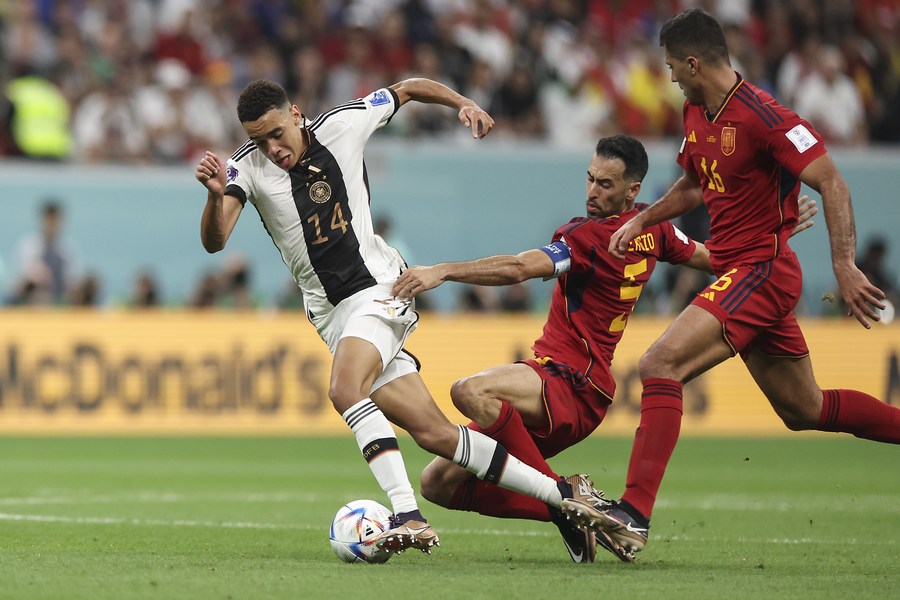 Jamal Musiala (L) of Germany breaks through during the Group E match against Spain at the 2022 FIFA World Cup at Al Bayt Stadium in Al Khor, Qatar on Nov. 27, 2022. (Xinhua/Cao Can)