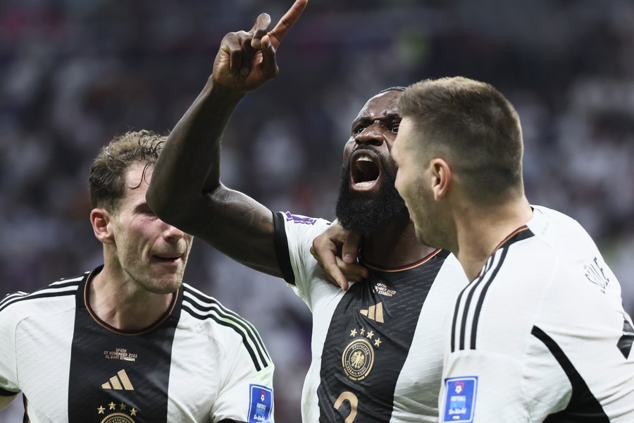 Niclas Fullkrug (R) of Germany celebrates scoring during the Group E match against Spain. (Xinhua/Cao Can)