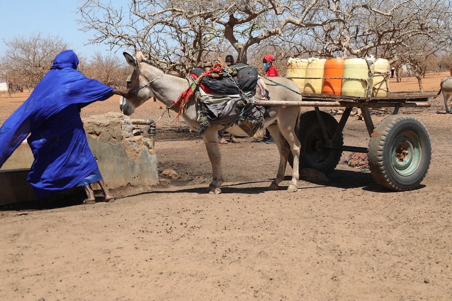 This file photo shows a woman pulling a donkey after fetching water at a borehole 25 kilometers from her home in Dertu, Garissa County, Kenya, Nov. 10, 2021. (Photo by Stephen Ingati/Xinhua)