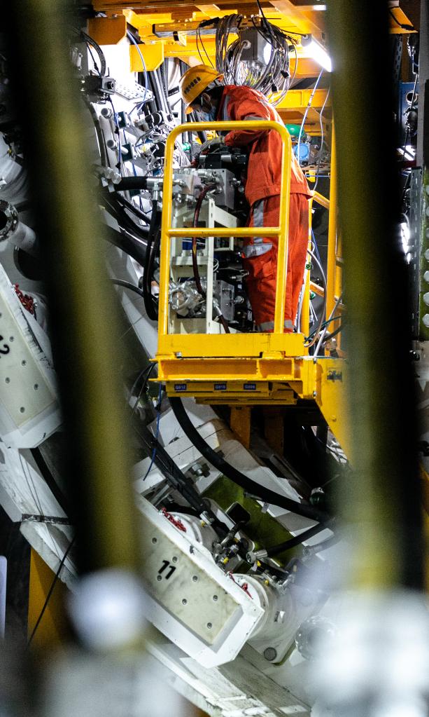 An employee works on a tunnel boring machine at a workshop of China Railway Engineering Equipment Group Co., Ltd. (CREG) in Zhengzhou, central China's Henan Province, Nov. 23, 2022. (Xinhua)