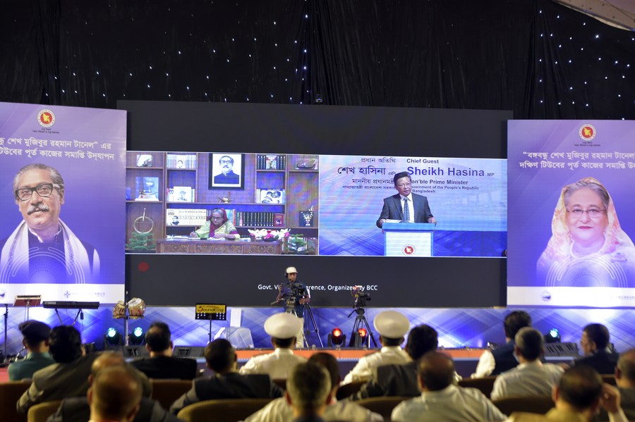 Bangladeshi Prime Minister Sheikh Hasina speaking virtually at a ceremony to celebrate the successful completion of the civil work for a tube of China-funded mega-river tunnel in Chattogram, Bangladesh on Nov. 26, 2022. (Xinhua)