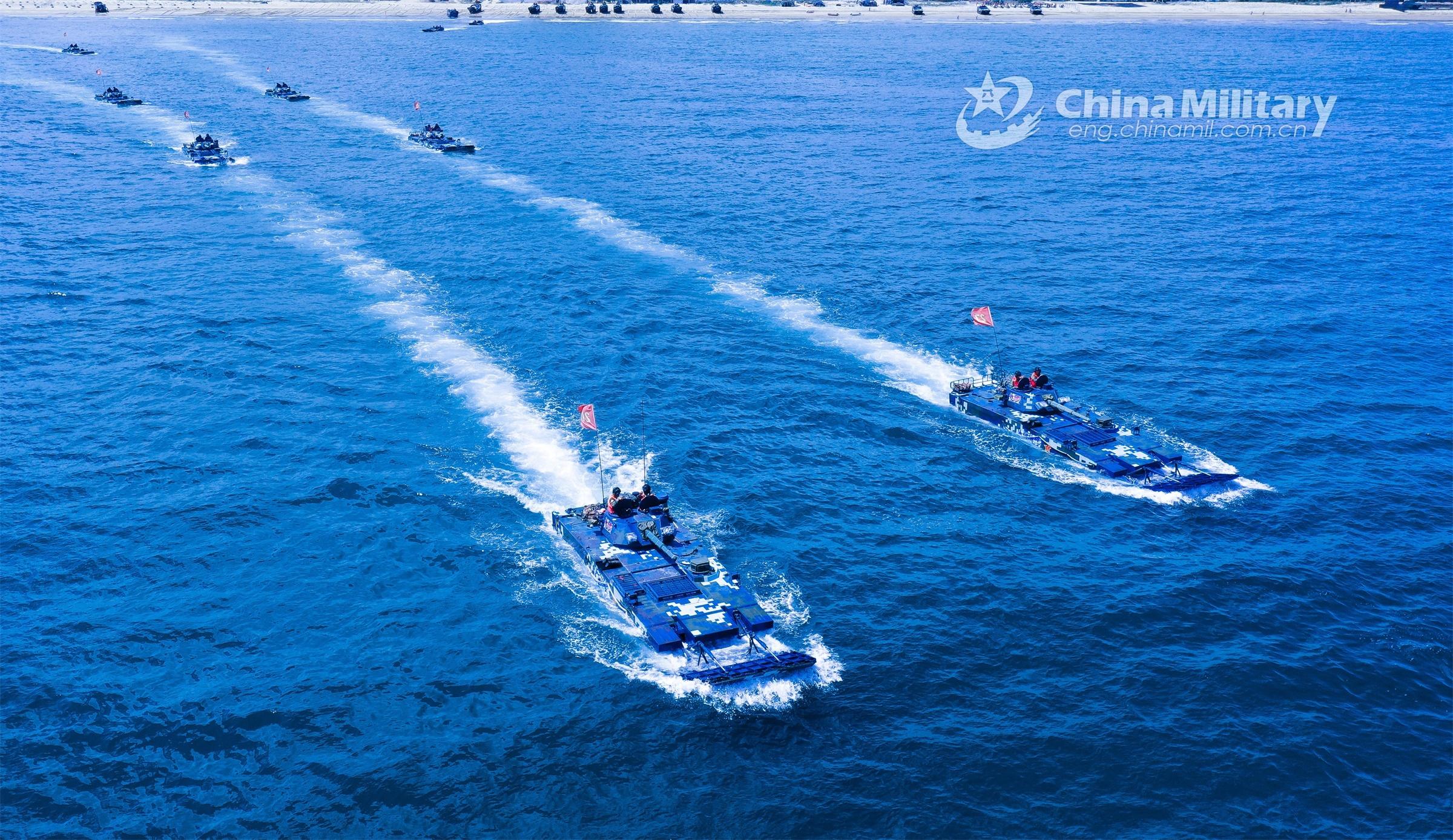 Amphibious armored vehicles attached to a brigade of the PLA Navy's Marine Corps make their way to the beach-head during a maritime offense and defense training exercise recently. (eng.chinamil.com.cn/Photo by Tang Ruijie)