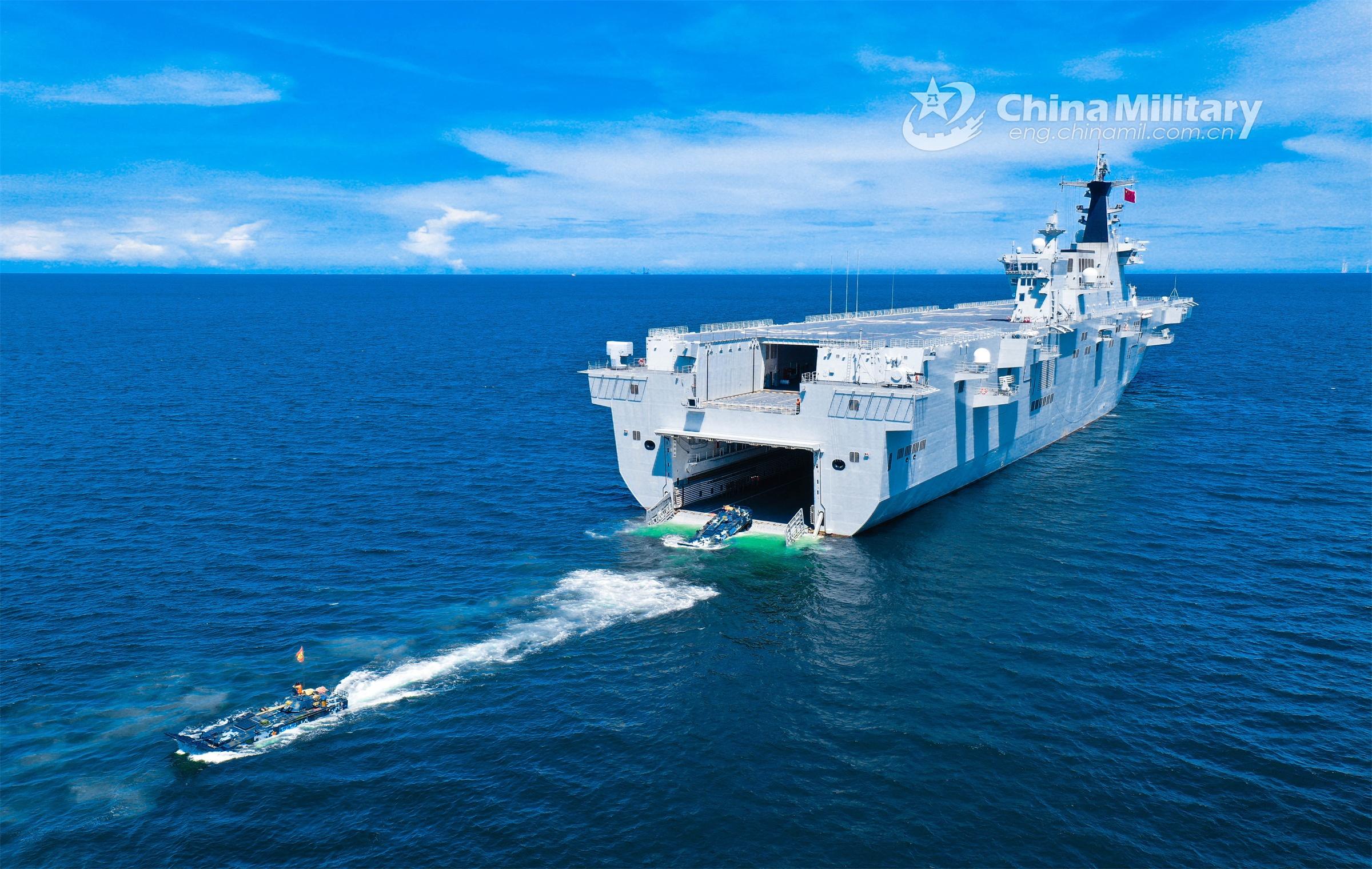 Amphibious armored vehicles attached to a brigade of the PLA Navy's Marine Corps disembark from a dock landing ship during a maritime offense and defense training exercise recently. (eng.chinamil.com.cn/Photo by Tang Ruijie)