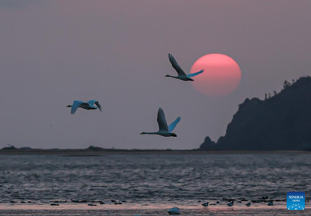 Whooper swans fly over a wetland in Chengshan Township of Rongcheng, east China's Shandong Province, Nov. 27, 2022. (Photo by Li Xinjun/Xinhua)