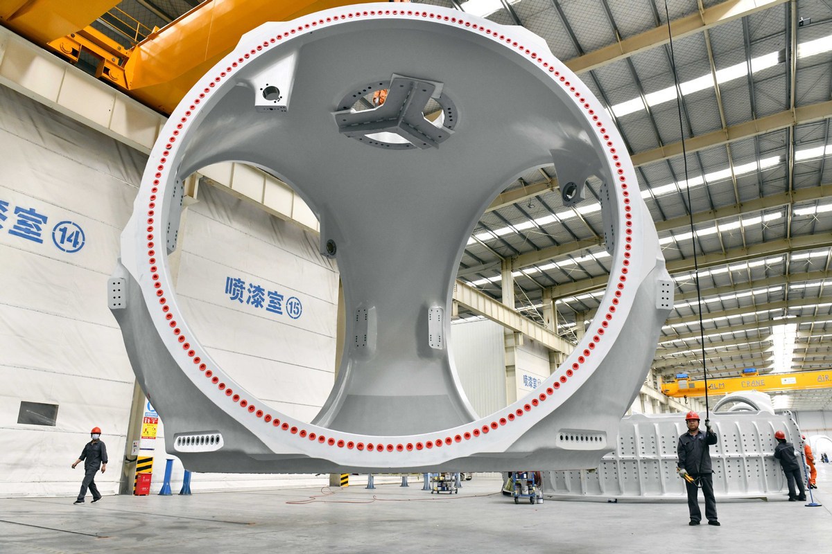 Staff members work at a workshop of a wind power equipment industrial base in Huimin county, East China's Shandong province, June 7, 2022. [Photo/Xinhua]