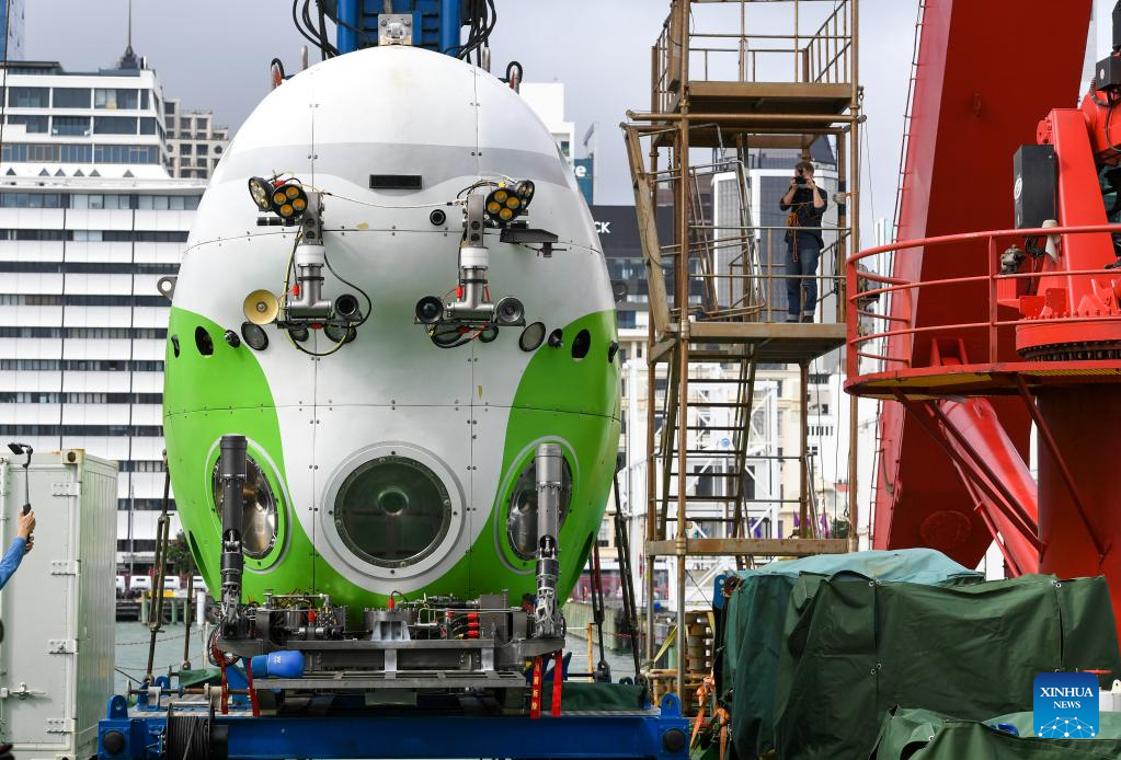 China's research vessel Tansuoyihao loaded with the Human Occupied Vehicle Fendouzhe docks at Queens Wharf in Auckland, New Zealand, Nov. 27, 2022. (Xinhua/Guo Lei)