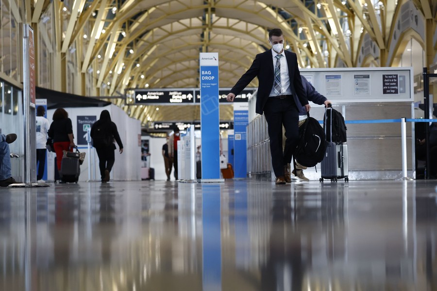 Travelers walk through terminals at Ronald Reagan Washington National Airport in Arlington, Virginia, the United States, April 14, 2022. (Photo by Ting Shen/Xinhua)