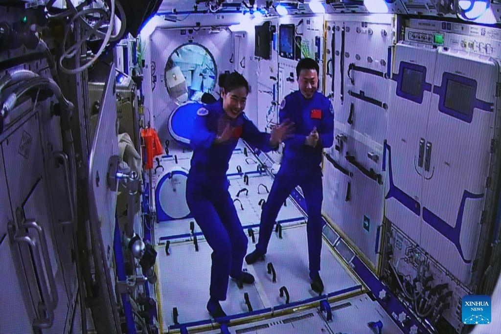 BEIJING, Nov. 30 (Xinhua) -- The three astronauts aboard China's Shenzhou-15 spaceship entered the country's space station and met with another astronaut trio on Wednesday, a historic gathering that added the manpower at the in-orbit space lab to six for the first time.