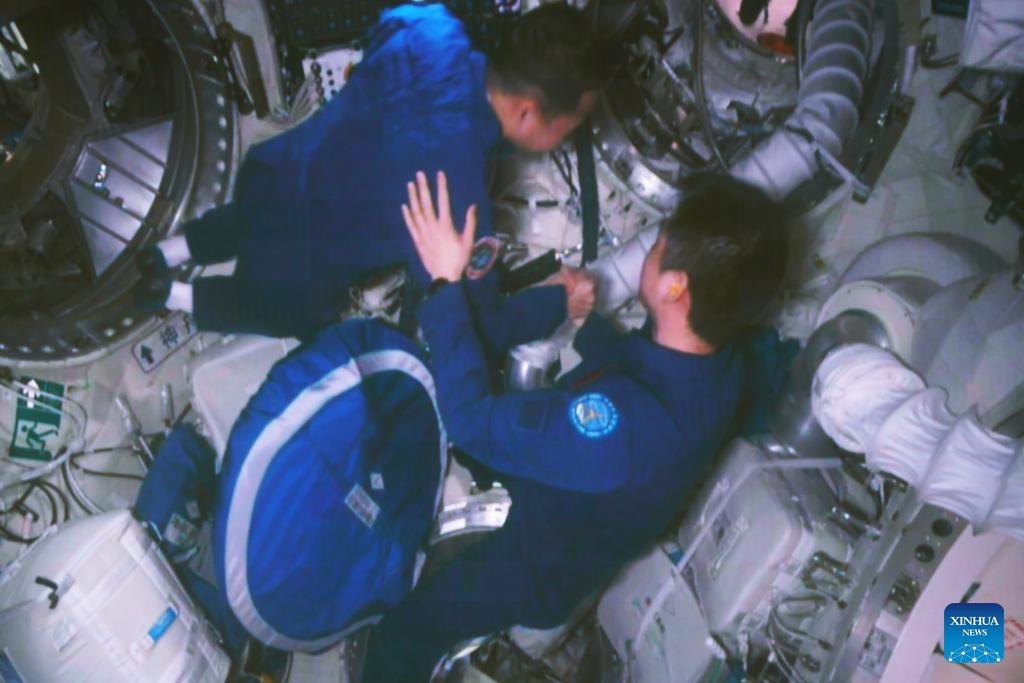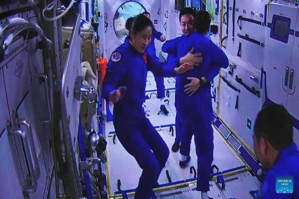 The space reunion kicked off the first in-orbit crew rotation in China's space station, according to the China Manned Space Agency (CMSA).