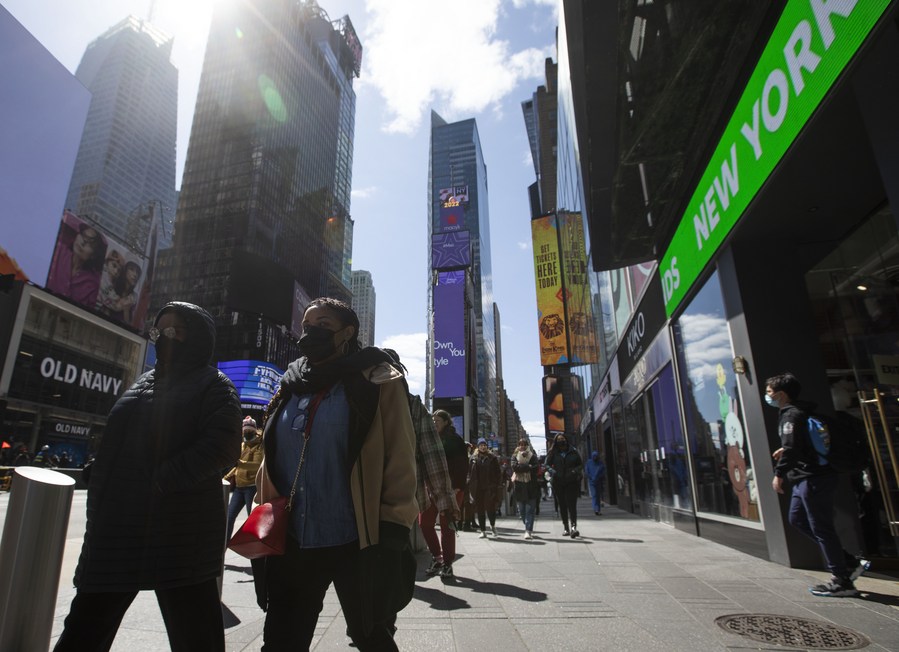 People walk on Times Square in New York, the United States, March 29, 2022. (Xinhua/Wang Ying)