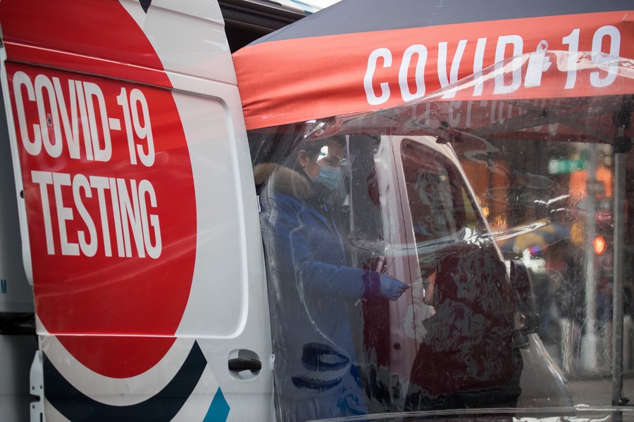 A medical worker collects a swab sample from a person at a COVID-19 testing site on Times Square in New York, the United States, March 29, 2022. (Xinhua/Wang Ying)
