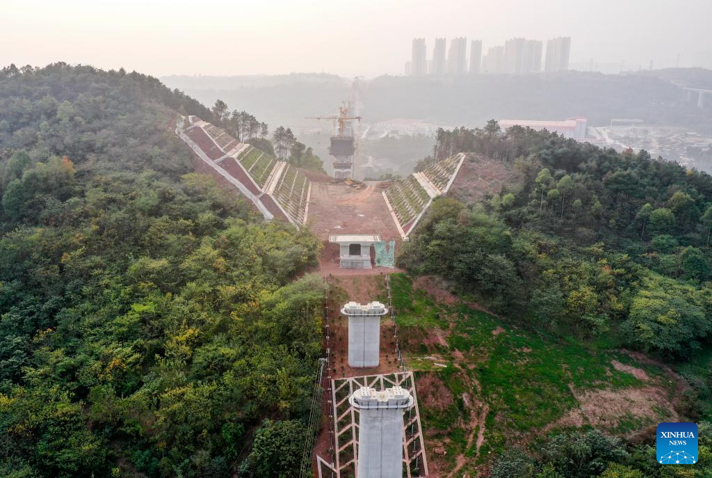 This aerial photo taken on Nov. 28, 2022 shows the Huafu mega bridge under construction at the Sichuan-Chongqing section of the Chongqing-Kunming high-speed railway in southwest China's Chongqing Municipality. The 699-kilometer-long Chongqing-Kunming high-speed railway with a designed speed of 350 kilometers per hour is a key constituent of the railway corridor linking China's capital Beijing and Kunming in southwest China's Yunnan Province. (Xinhua/Wang Quanchao)