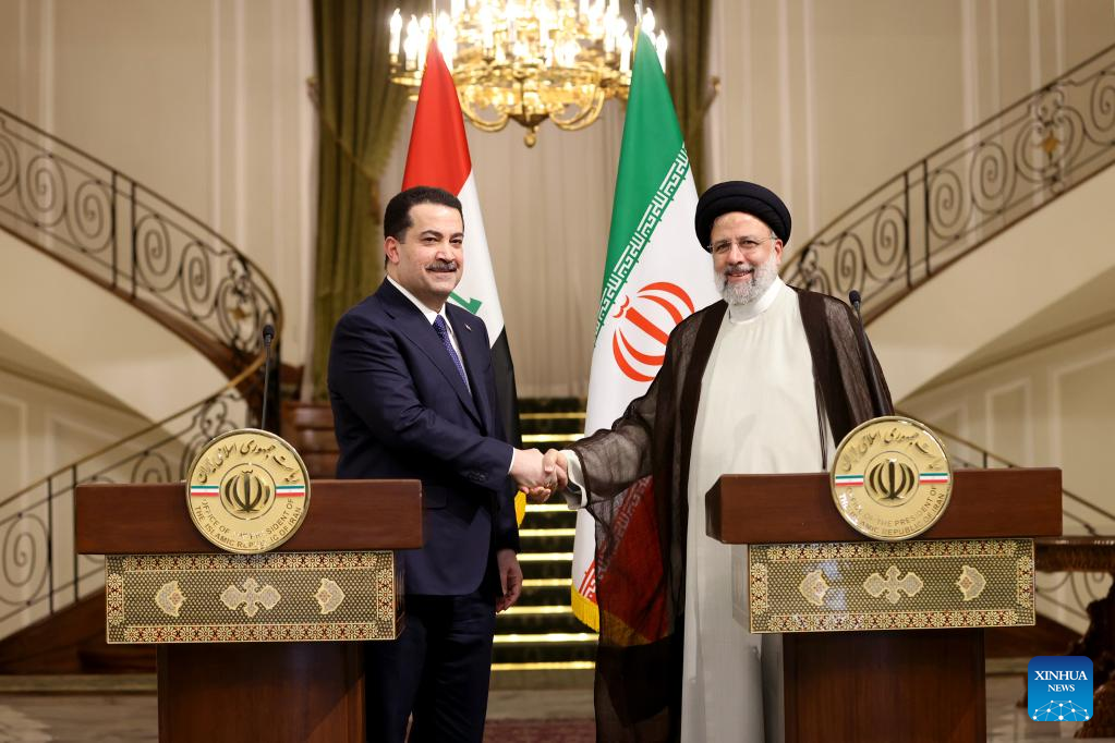 Iranian President Ebrahim Raisi (R) shakes hands with visiting Iraqi Prime Minister Mohammed Shia' al-Sudani during a joint press conference in Tehran, Iran, Nov. 29, 2022. Iranian President Ebrahim Raisi said here Tuesday that Iran and Iraq have agreed to work together to improve bilateral ties and safeguard regional security. (Iranian Presidential Website/Handout via Xinhua)