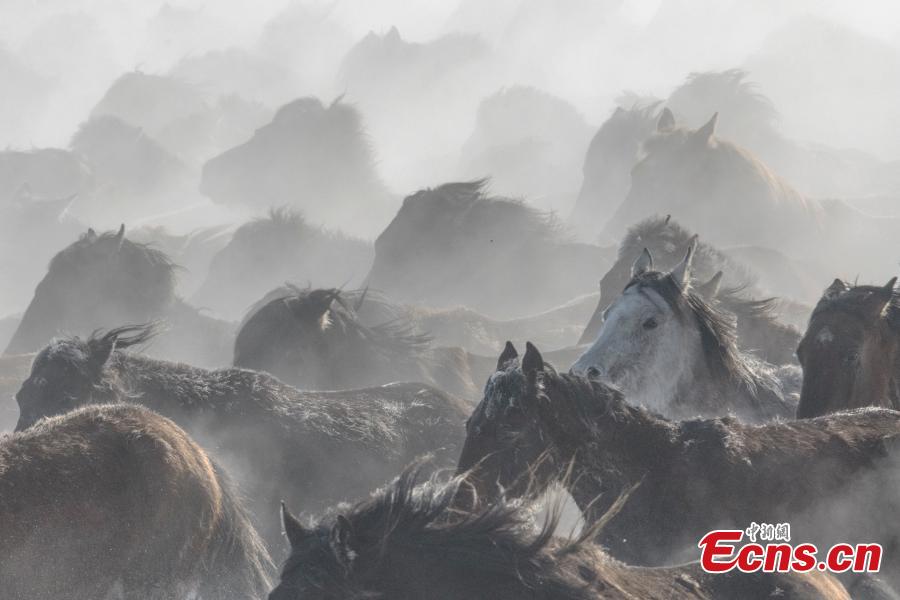 A herd of horses gallop on snow-covered prairie in Zhaosu county, known as "hometown of pegasus", Kazak Autonomous Prefecture of Ili, northwest China's Xinjiang Uygur Autonomous Region, Nov. 27, 2022. (Photo: China News Service/Li Wenwu)