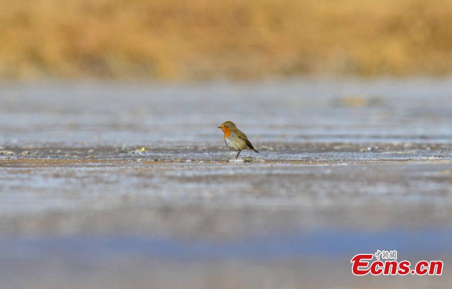 A rare robin bird rests on the lake side in Mangya city, northwest China's Qinghai Province. (Photo: China News Service/Wang Xiaojiong)