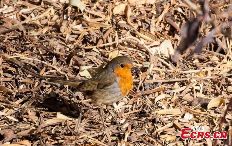 A rare robin bird forages in grass in Mangya city, northwest China's Qinghai Province. (Photo: China News Service/Wang Xiaojiong)