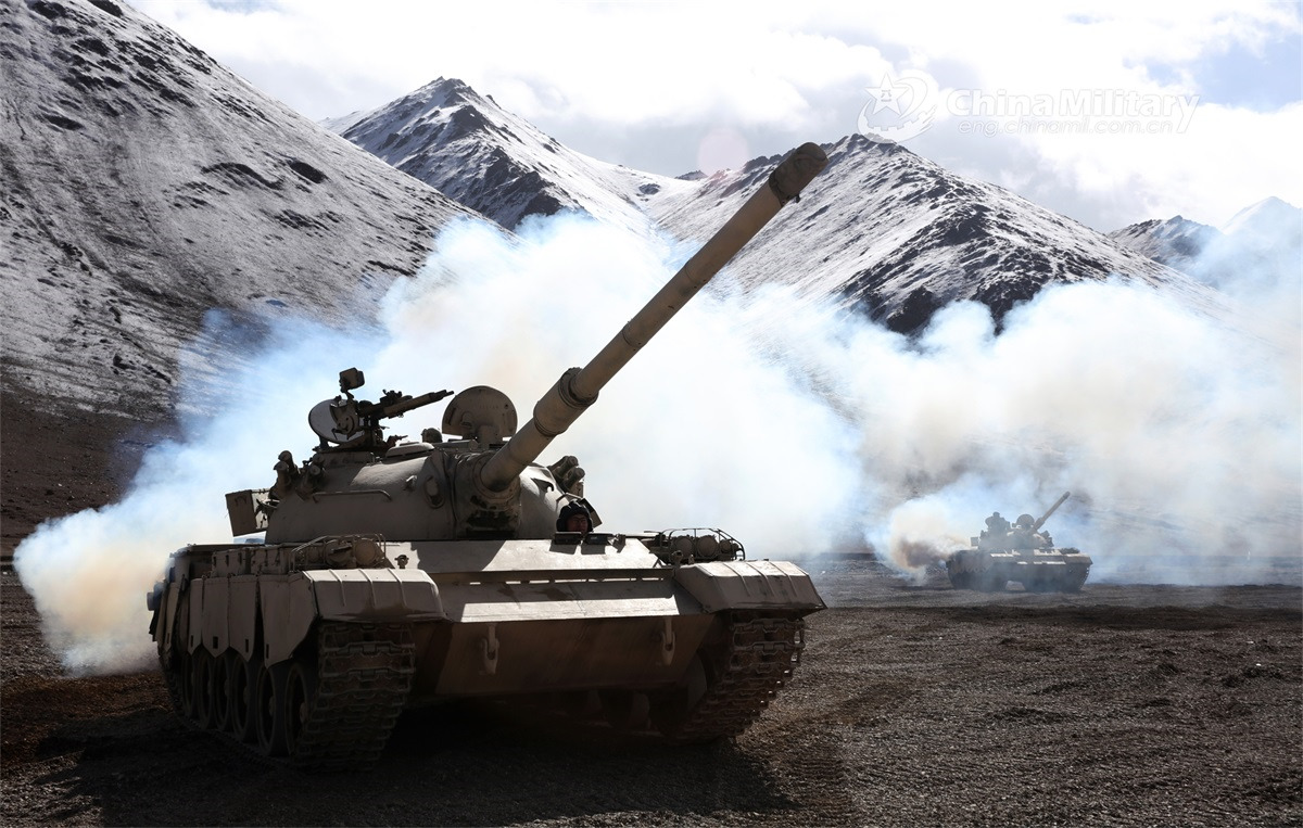 Main battle tanks attached to an armored element of a combined-arms regiment under the PLA Xinjiang Military Command rumble in the mountainous region during a driving drill on November 18, 2022. (eng.chinamil.com.cn/Photo by Yuan Kai)