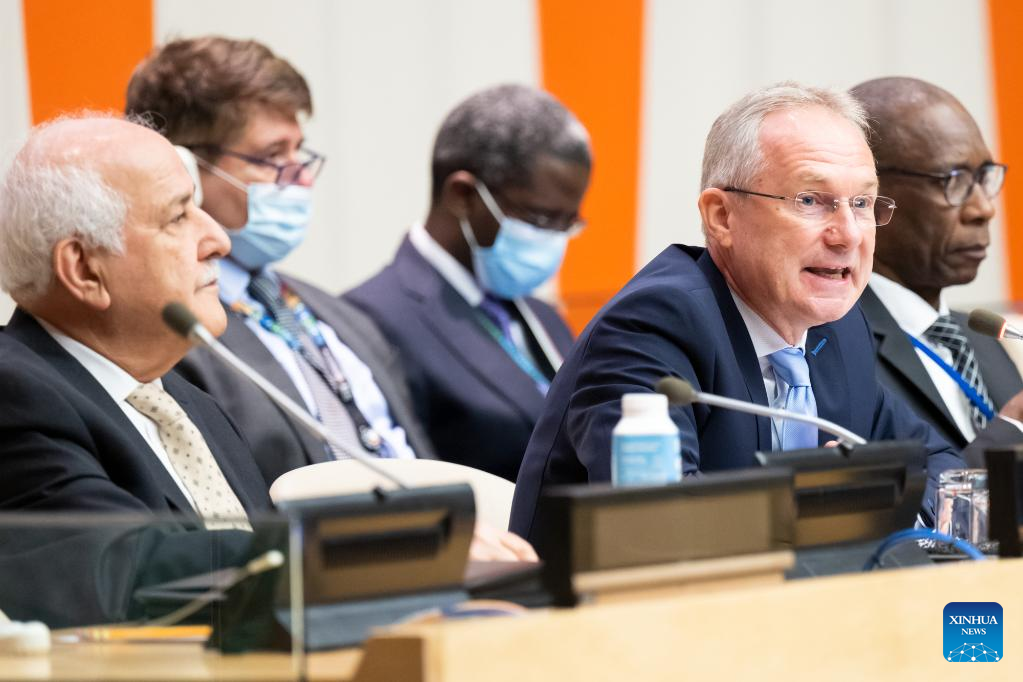 UN General Assembly President Csaba Korosi (2nd R) speaks at a General Assembly special meeting in observance of the International Day of Solidarity with the Palestinian People at the UN headquarters in New York, on Nov. 29, 2022. Korosi on Tuesday stressed the importance of bringing hope to Palestinians, especially the young generation. (Mark Garten/UN Photo/Handout via Xinhua)