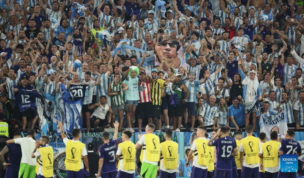 Players of Argentina celebrate with fans after the Group C match between Poland and Argentina at the 2022 FIFA World Cup at Stadium 974 in Doha, Qatar, Nov. 30, 2022. (Xinhua/Lan Hongguang)