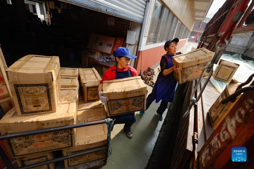 Staff members of Ya'an Youyi Tea Co., Ltd. load boxes of Tibetan tea, a kind of dark tea, onto a truck in Ya'an, southwest China's Sichuan Province, Nov. 24, 2022. Boasting a long history of tea cultivation, Ya'an is the birthplace of dark tea and green tea making techniques. Inherited by generations of tea makers, both techniques are now listed as national-level intangible cultural heritage. (Xinhua/Shen Bohan)