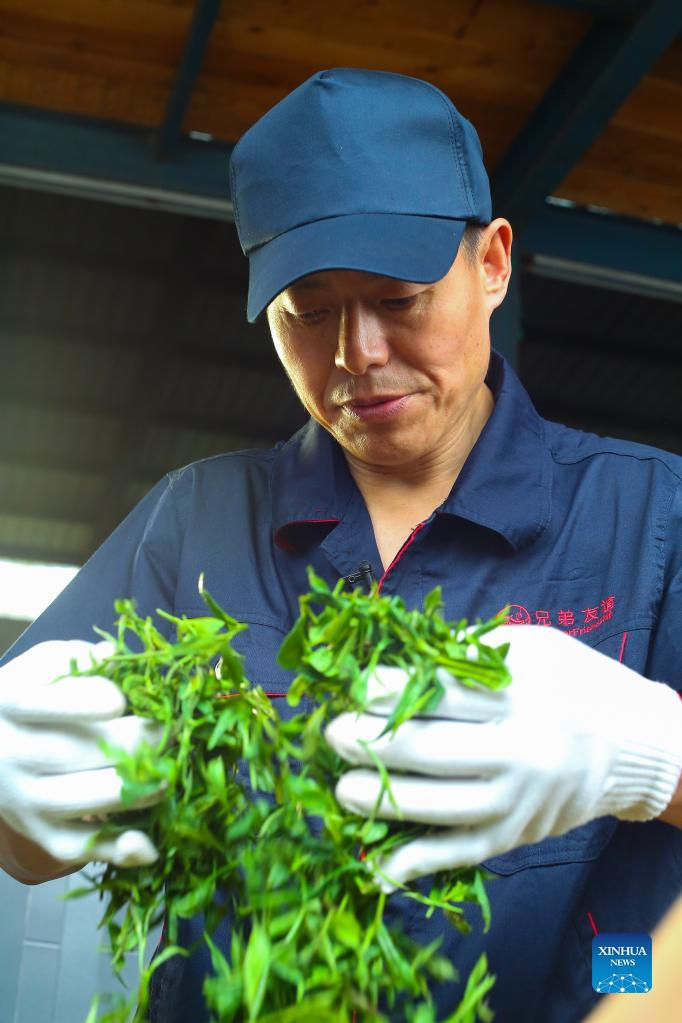 Zhang Yuehua dries newly-picked tea leaves at his ancestral house in Mingshan District of Ya'an City, southwest China's Sichuan Province, March 31, 2022. Zhang, born in 1959, is a representative inheritor of green tea making technique. Boasting a long history of tea cultivation, Ya'an is the birthplace of dark tea and green tea making techniques. Inherited by generations of tea makers, both techniques are now listed as national-level intangible cultural heritage. (Xinhua/Shen Bohan)