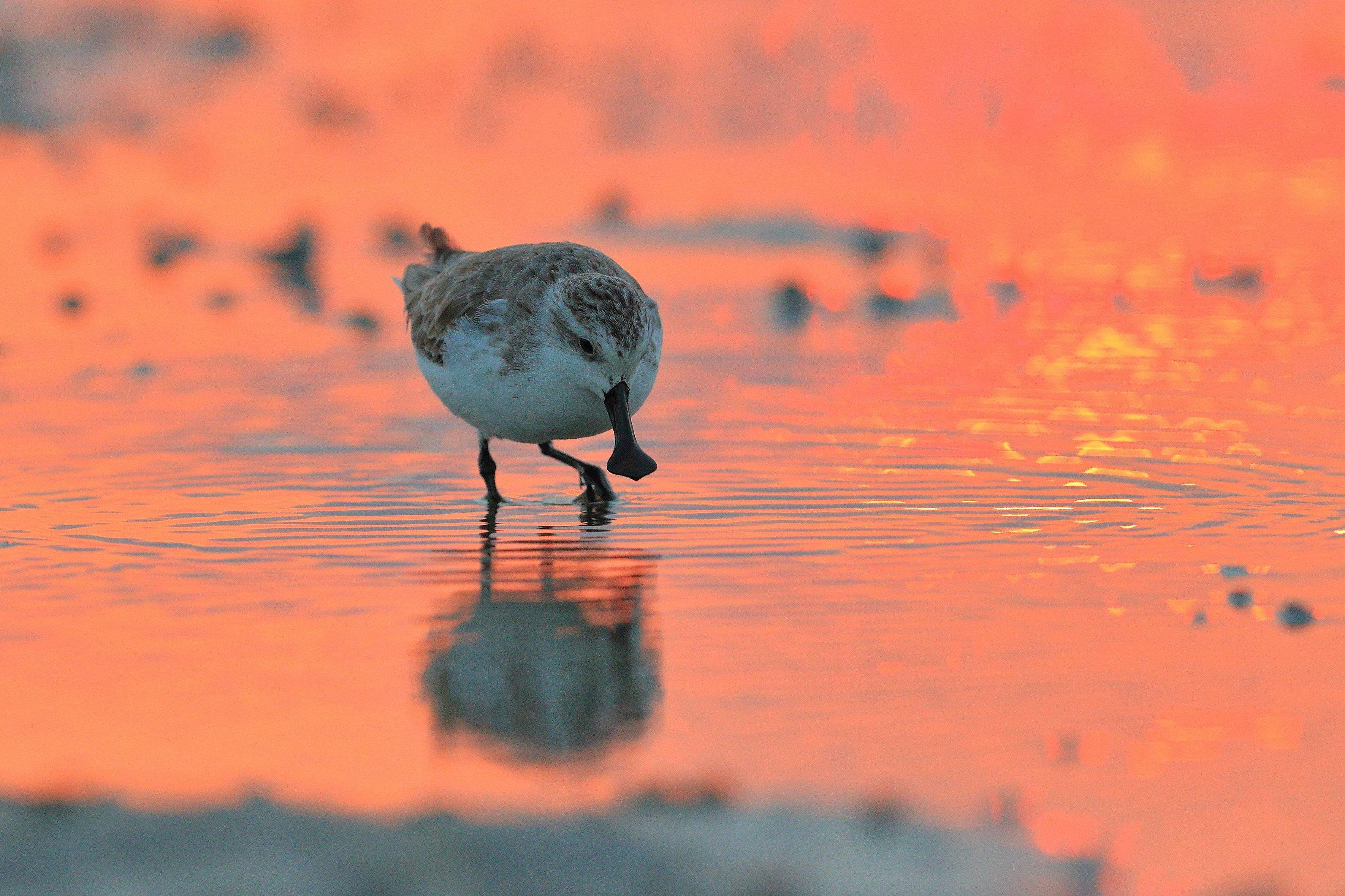 A spoon-billed sandpiper bathes in the sunset in Leizhou Bay, Zhanjiang city, south China's Guangdong Province. (Photo/Cheng Li)