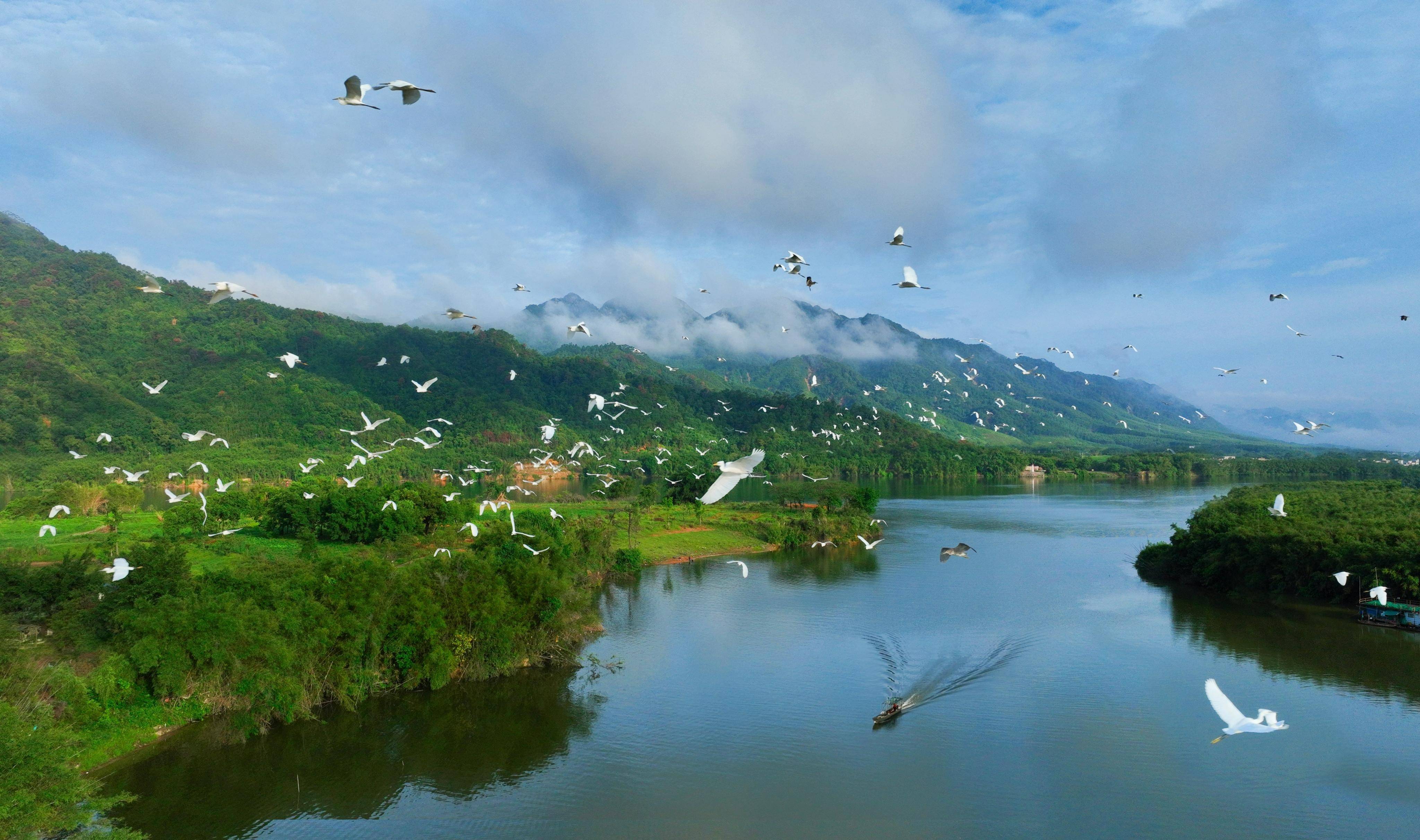 A flock of egrets flies over the river at the Boluokeng village, Dazhan township, Yingde city, south China’s Guangdong Province. (Photo/Chen Weidong)