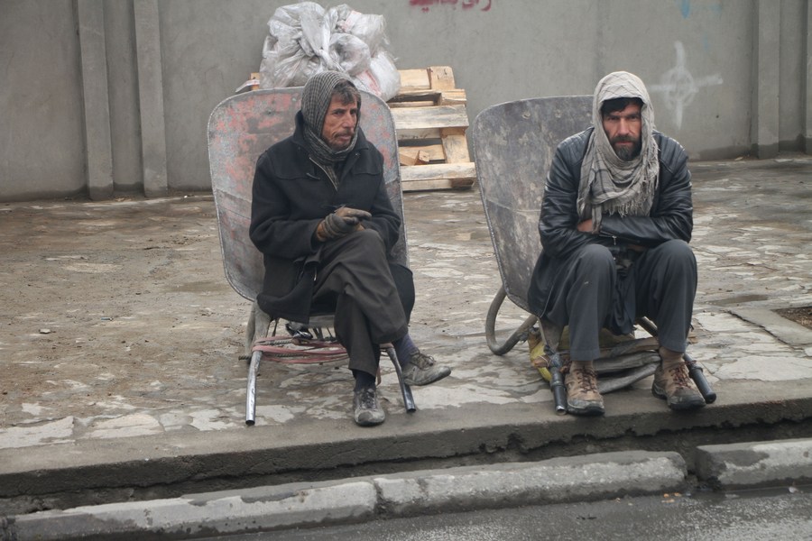 Afghan men wait for work in Kabul, Afghanistan, on Dec. 23, 2021. (Photo by Saifurahman Safi/Xinhua)