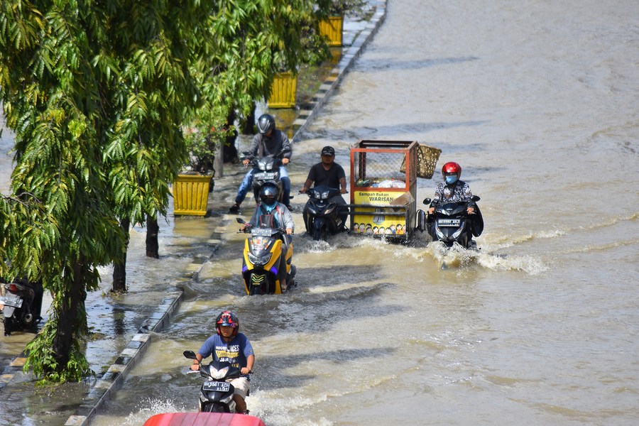 People ride motorbikes through flood water in Medan, North Sumatra, Indonesia, Nov. 19, 2022. (Photo by Wijaya/Xinhua)