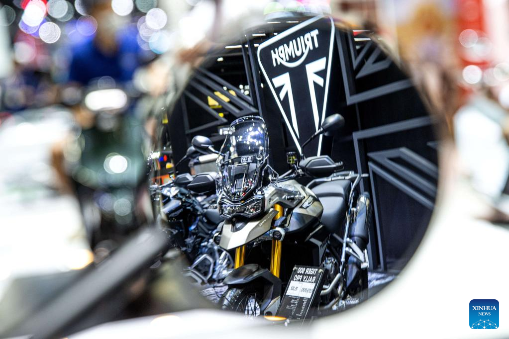 This photo taken on Dec. 1, 2022 shows a motorcycle reflected in a mirror during the Thailand International Motor Expo 2022 in Bangkok, Thailand. (Xinhua/Wang Teng)
