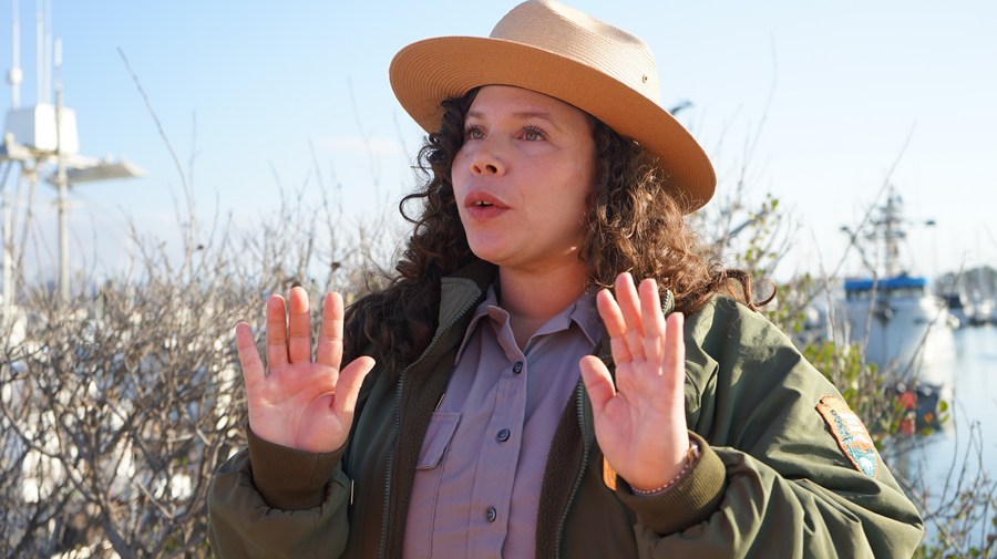 Jasmine Reinhardt, chief of interpretation and education at U.S. Channel Islands National Park, is seen during an interview in Ventura, California, the United States, on Nov. 29, 2022. (Photo by Zeng Hui/Xinhua)