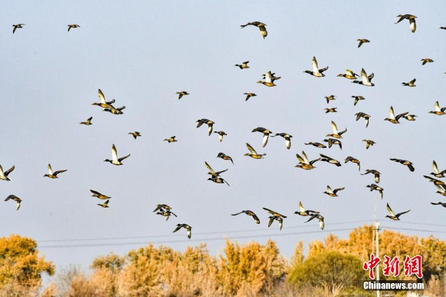 A flock of wild ducks fly over a reed wetland along Tarim River in northwest China's Xinjiang Uygur Autonomous Region. (Photo: China News Service/Wang Yanshun)