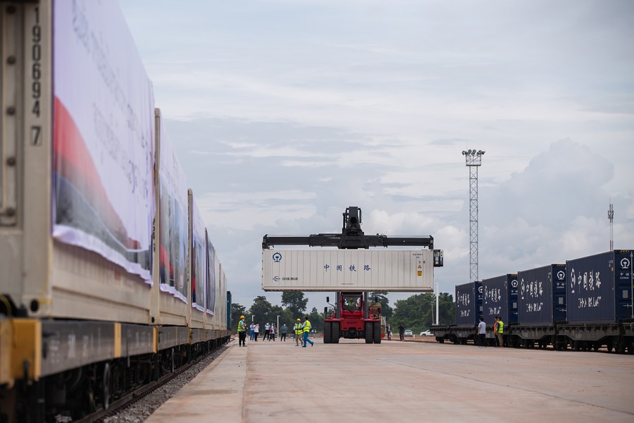Containers are reloaded at a freight transit yard of China-Laos Railway's Vientiane South Station on July 1, 2022. (Photo by Kaikeo Saiyasane/Xinhua)