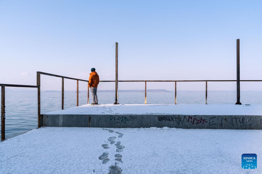 A man enjoys seaside view on a snow-covered pier in Vladivostok, Russia, Dec. 3, 2022. (Photo by Guo Feizhou/Xinhua)