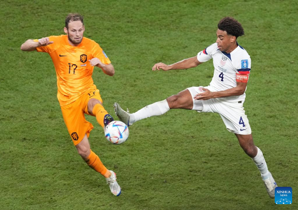 Daley Blind (L) of the Netherlands vies with Tyler Adams of the United States during their Round of 16 match at the 2022 FIFA World Cup at Khalifa International Stadium in Doha, Qatar, Dec. 3, 2022. (Xinhua/Chen Cheng)