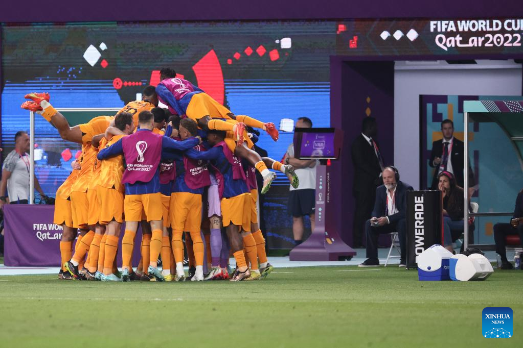 Players of the Netherlands celebrate a goal by Daley Blind during the Round of 16 match between the Netherlands and the United States at the 2022 FIFA World Cup at Khalifa International Stadium in Doha, Qatar, Dec. 3, 2022. (Xinhua/Lan Hongguang)