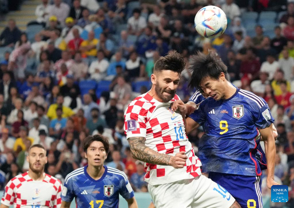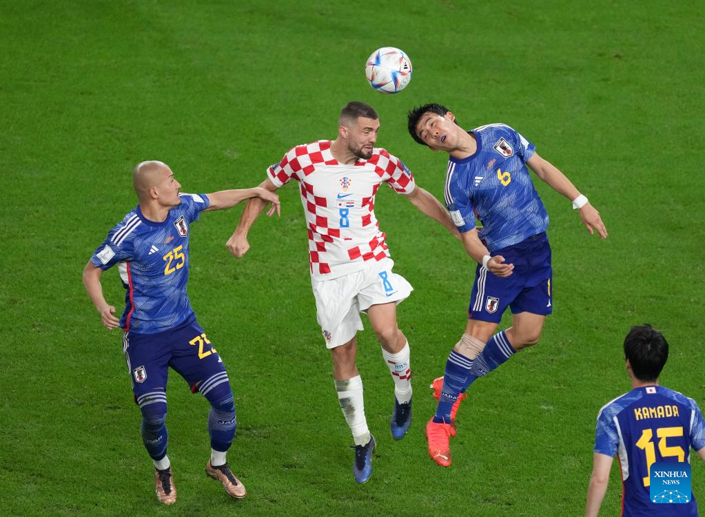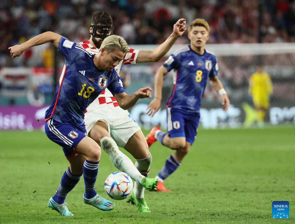 Ito Junya of Japan (C) vies for the ball during the Round of 16 match between Japan and Croatia at the 2022 FIFA World Cup at Al Janoub Stadium in Al Wakrah, Qatar, Dec. 5, 2022. (Xinhua/Li Ming)