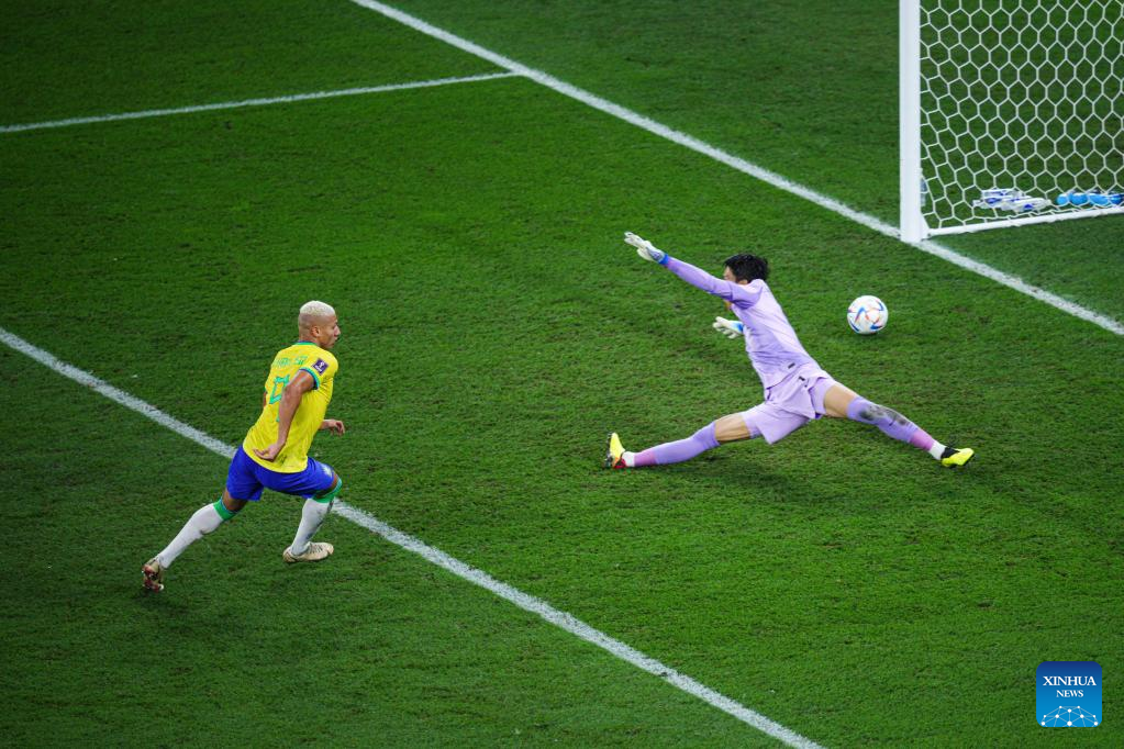 Richarlison of Brazil scores the goal during the Round of 16 match between Brazil and South Korea at the 2022 FIFA World Cup at Stadium 974 in Doha, Qatar, Dec. 5, 2022. (Xinhua/Xin Yuewei)