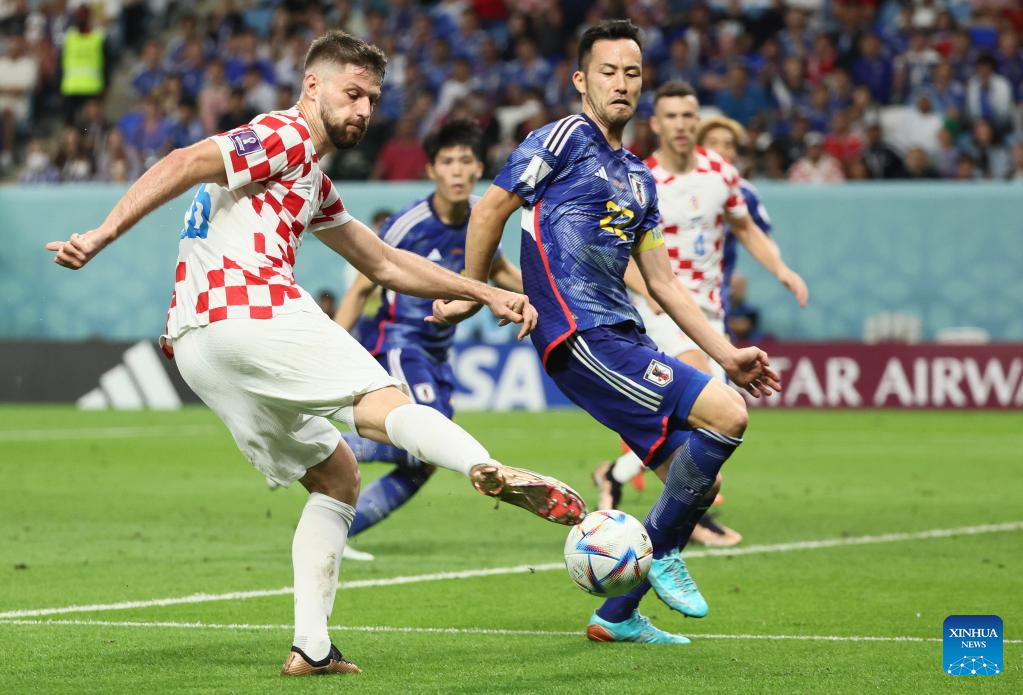 Bruno Petkovic (L) of Croatia shoots past Yoshida Maya of Japan during their Round of 16 match at the 2022 FIFA World Cup at Al Janoub Stadium in Al Wakrah, Qatar, Dec. 5, 2022. (Xinhua/Lan Hongguang)