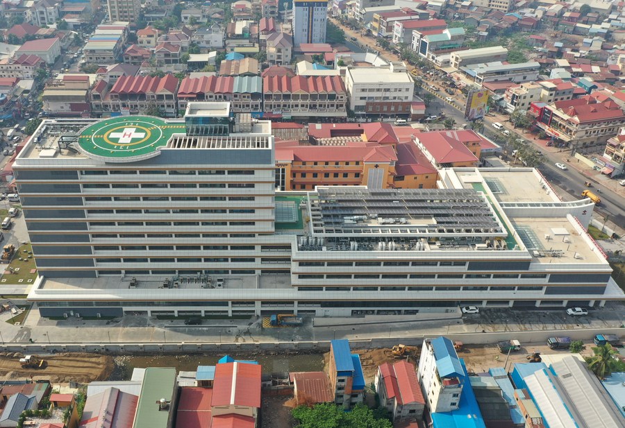 This aerial photo taken on March 19, 2022 shows the Cambodia-China Friendship Medical Building in Phnom Penh, Cambodia. (Photo by Ly Lay/Xinhua)