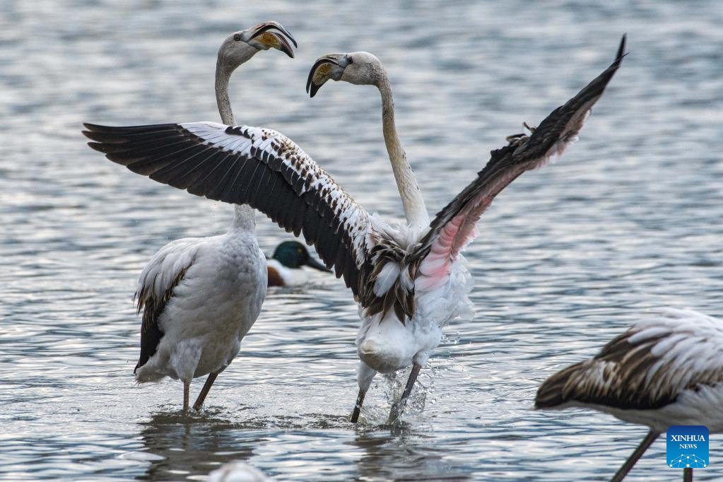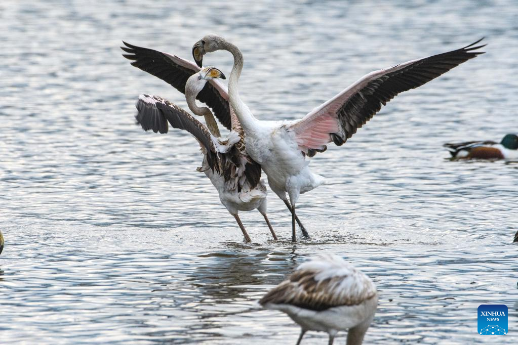 Migrating greater flamingos are seen in Hula Valley, northern Israel, on Dec. 6, 2022. (Ayal Margolin/JINI via Xinhua)