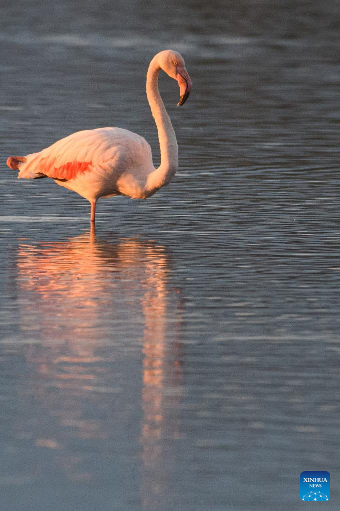 A migrating greater flamingo is seen in Hula Valley, northern Israel, on Dec. 6, 2022. (Ayal Margolin/JINI via Xinhua)