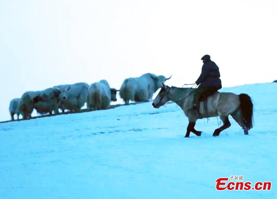 Herders drive livestock heading for a winter pasture in northwest China's Xinjiang Uyghur Autonomous Region. (Photo: China News Service/Yuan Junping)
