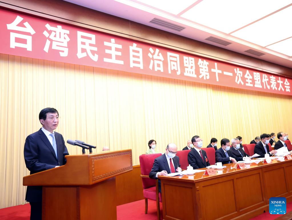 Wang Huning, a member of the Standing Committee of the Political Bureau of the Communist Party of China (CPC) Central Committee, delivers a congratulatory message to the 11th national congress of the Taiwan Democratic Self-Government League on behalf of the CPC Central Committee, in Beijing, capital of China, Dec. 7, 2022. The congress opened on Wednesday. (Xinhua/Ju Peng)