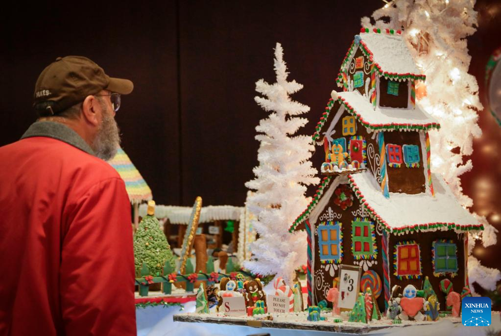 People look at a gingerbread house creation at the 30th Gingerbread Lane event held in Vancouver, British Columbia, Canada, on Dec. 7, 2022. (Photo by Liang Sen/Xinhua)