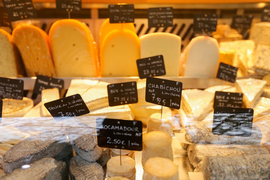 Dairy products and price tags are seen at a market in Brussels, Belgium, on Nov. 4, 2022. (Xinhua/Zheng Huansong)