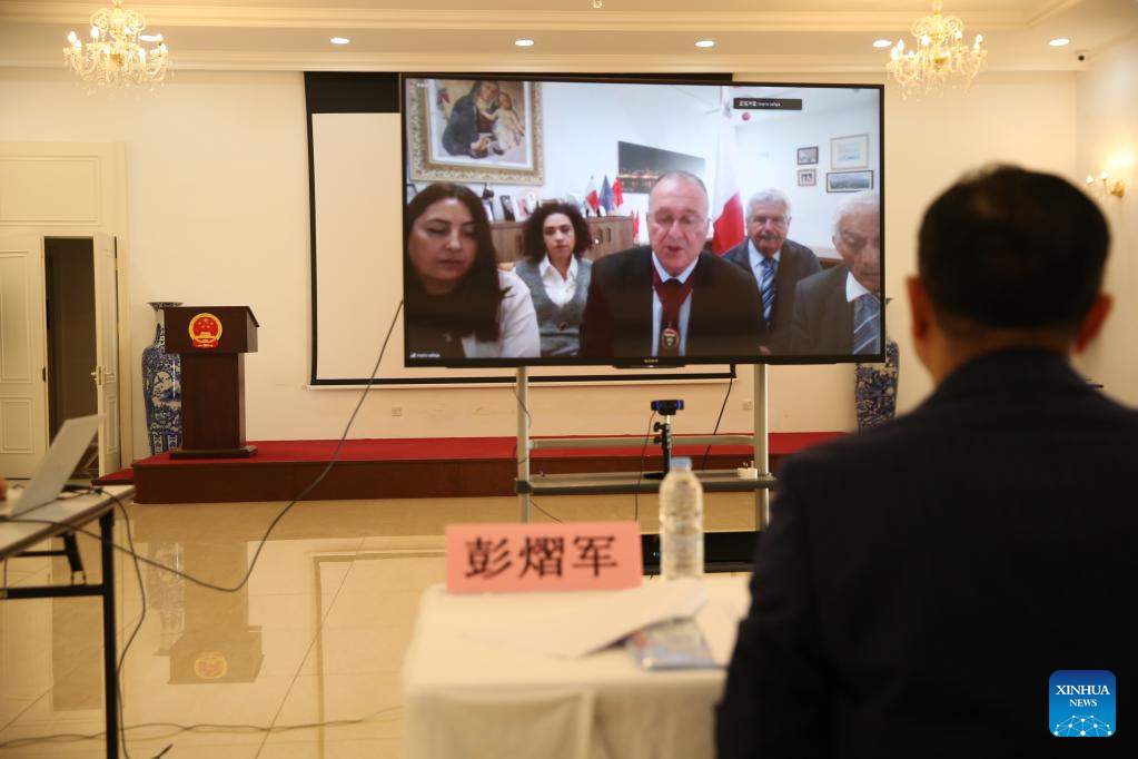 Photo taken in St. Julian's, Malta, on Dec. 7, 2022 shows Mario Calleja (C, on the screen), mayor of Marsaskala, speaking at an online signing ceremony of a sister city agreement. Marsaskala, a seaside town in the southeast of Malta, and Dujiangyan, a city in China's southwestern Sichuan Province, signed a sister city agreement on Wednesday. (Xinhua/Chen Wenxian)